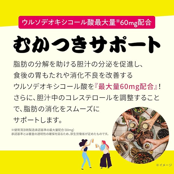ウコン末やウルソデオキシコール酸を配合し、飲みすぎ・食べすぎによる胃の不快感、二日酔い、悪酔い後の不快症状を和らげ、翌朝の快適な目覚めをサポートします。